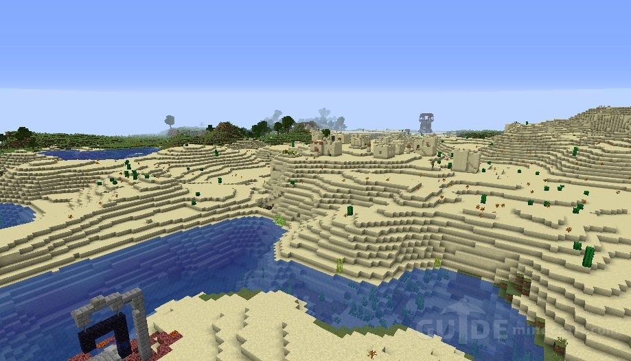 The spawn point is located near the desert temple. Nearby you can find a village, under which a steep abandoned mine is hidden. It is very large and occupies several “floors”. In addition to chests in minecarts, you can also find a treasury with a zombie spawner.